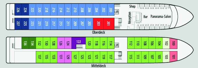 Beachten Sie bitte, dass nicht alle Flussschiffe über einen Fahrstuhl verfügen. Auch wenn ein Fahrstuhl vorhanden ist, führt dieser nicht auf das Sonnendeck und kann unter Umständen außer Betrieb sein. Die Treppen zum Sonnendeck sowie die teilweise steile Gangway müssen eigenständig bewältigt werden können. Des Weiteren ist es gängig, dass Flussschiffe im sogenannten „Päckchen" (mehrere Schiffe nebeneinander) anlegen und die Passagiere evtl. zusätzliche Treppen auf dem Nachbarschiff überwinden müssen.