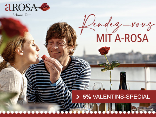 Entlang verwunschener Landschaften schippern Liebespaare in das große Glück. An Bord ein Dinner zu zweit bei einem Glas Rotwein, während die Sonne tiefrot am Horizont untergeht. Schaffen Sie gemeinsame Momente, die nicht nur die Liebe zueinander stärken, sondern auch ein Leben lang in Erinnerung bleiben - auf einer Kreuzfahrt mit A‑ROSA.